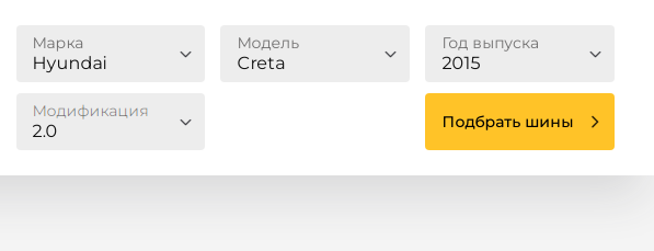 - При переходе на размерность шин или дисков будет осуществлен поиск в каталоге по заданным параметрам